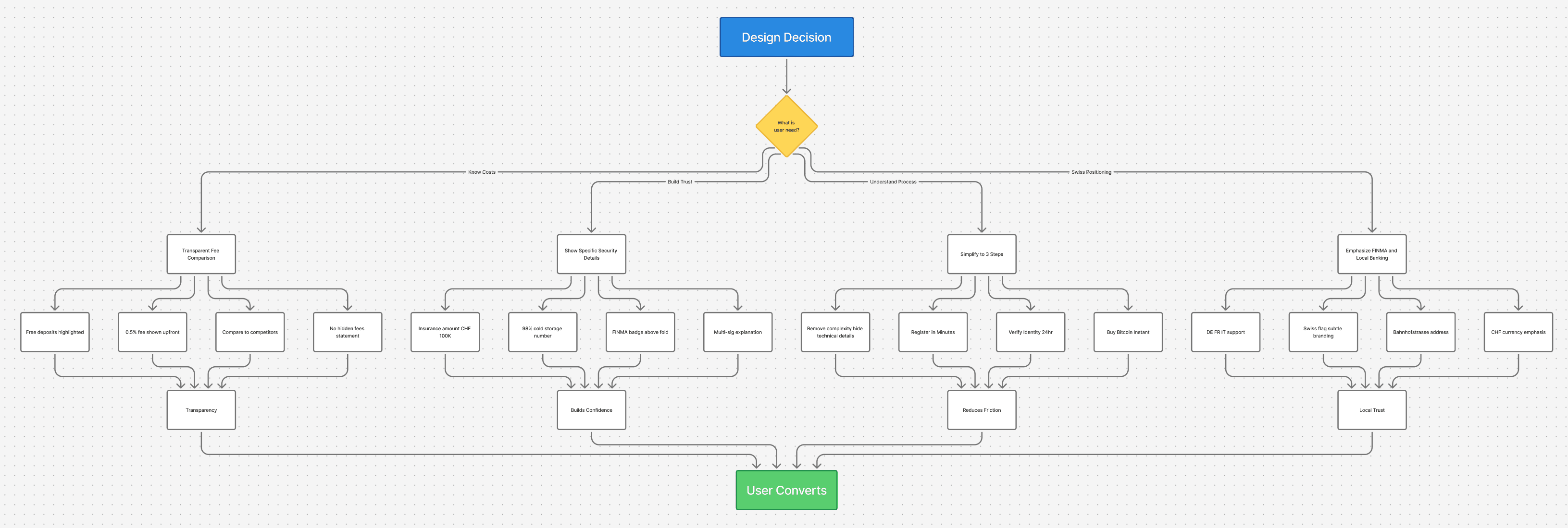 Visual Justification: Every color choice (Alpine Blue) and font selection (Suisse Int’l) was validated through this tree to ensure it met the "Institutional Credibility" branch of our goals.